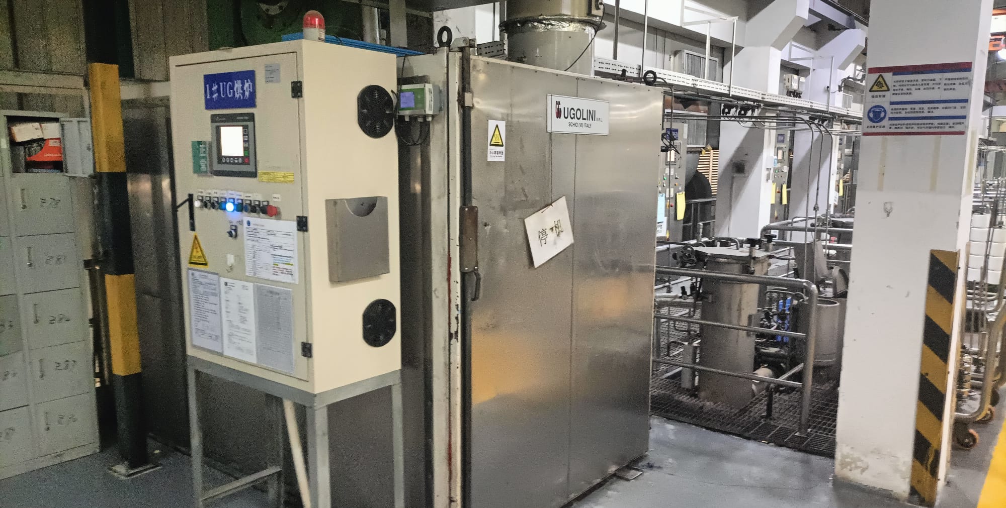 Il forno è dotato di valvola vapore proporzionale con convertitore IP e scarico condensa, oltre a un timer di condizionamento per il raffreddamento. L’aria di processo viene filtrata tramite filtro a carbone a tre stadi. I fumi di evacuazione sono convogliati attraverso un camino di scarico dotato di sonda di temperatura, con temperatura massima di esercizio pari a 135 °C.